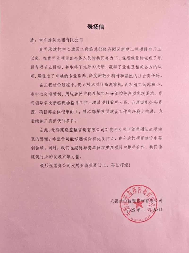 近日,无锡市崇安寺产业发展集团有限公司和无锡建设监理咨询有限公司向我司发来表扬信,对我司承建的中交建筑崇安寺三期项目各节点目标完成情况表示充分认可,对项目部全体工作人员的专业素养、敬业精神表示高度赞扬,在新年来临之际,对我司及项目部全体参建人员表示诚挚祝福与亲切慰问!