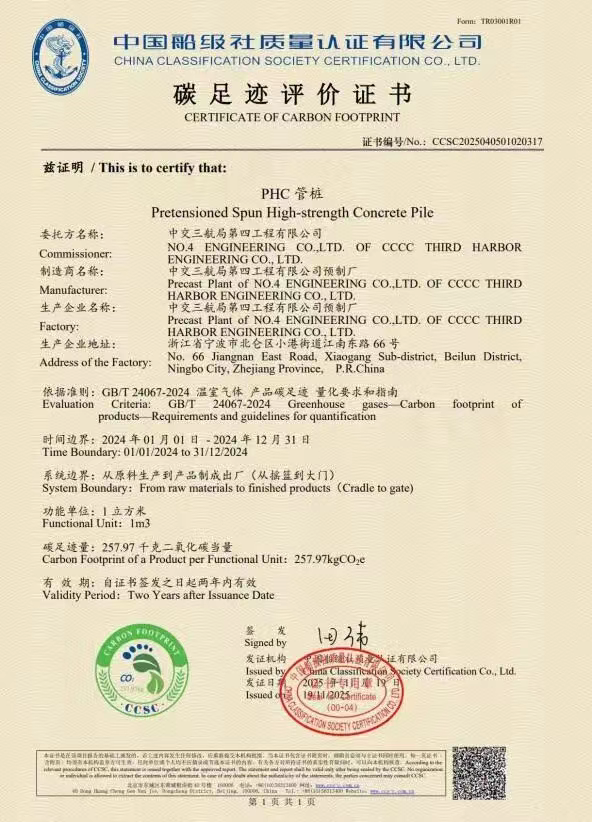 品質認證團隊對預製廠PHC管樁在原材料運輸、管節生產、管節拼樁、成品管樁吊運堆放、落駁以及全過程中能源消耗的詳實數據進行統計與分析,並根據數據建立產品碳足跡核算模型。核算結果顯示,PHC管樁產品每立方米混凝土的碳足跡為257.97千克二氧化碳當量。基於該結論,預製廠PHC管樁順利取得PHC管樁碳足跡評價證書。
