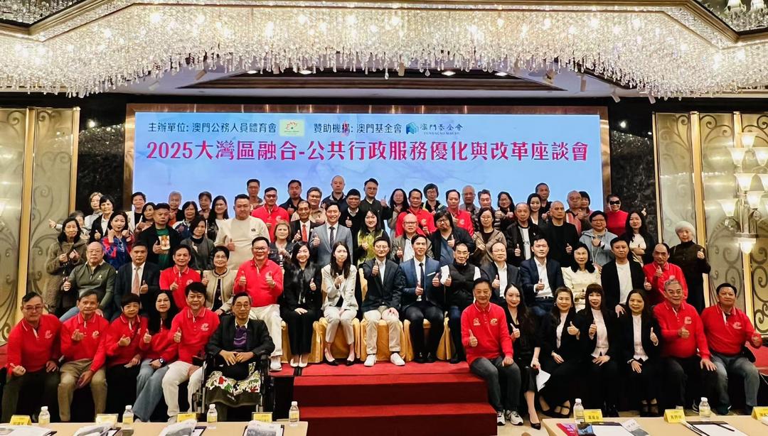 由澳門公務人員體育會主辦,澳門基金會贊助之2025大灣區融合-公共行政服務優化與改革座談會日前假座凱旋門酒店四樓宴會廳舉行,行政公職局代表梁少峰處長、市政署代表鄺漢民處長、教青局代表曹玉蘭代處長,澳門理工大學教授婁勝華、執業大律師程嘉雯、前市諮委陳溥森、深圳寶安區人大代表陳振宇、世邦傢俬建材城董事長侯沐天博士及公務人員體育會會長葛萬金擔任主講及分享嘉賓,與近百位出席者和公職團體代表分享議題及互動,場面熱鬧。