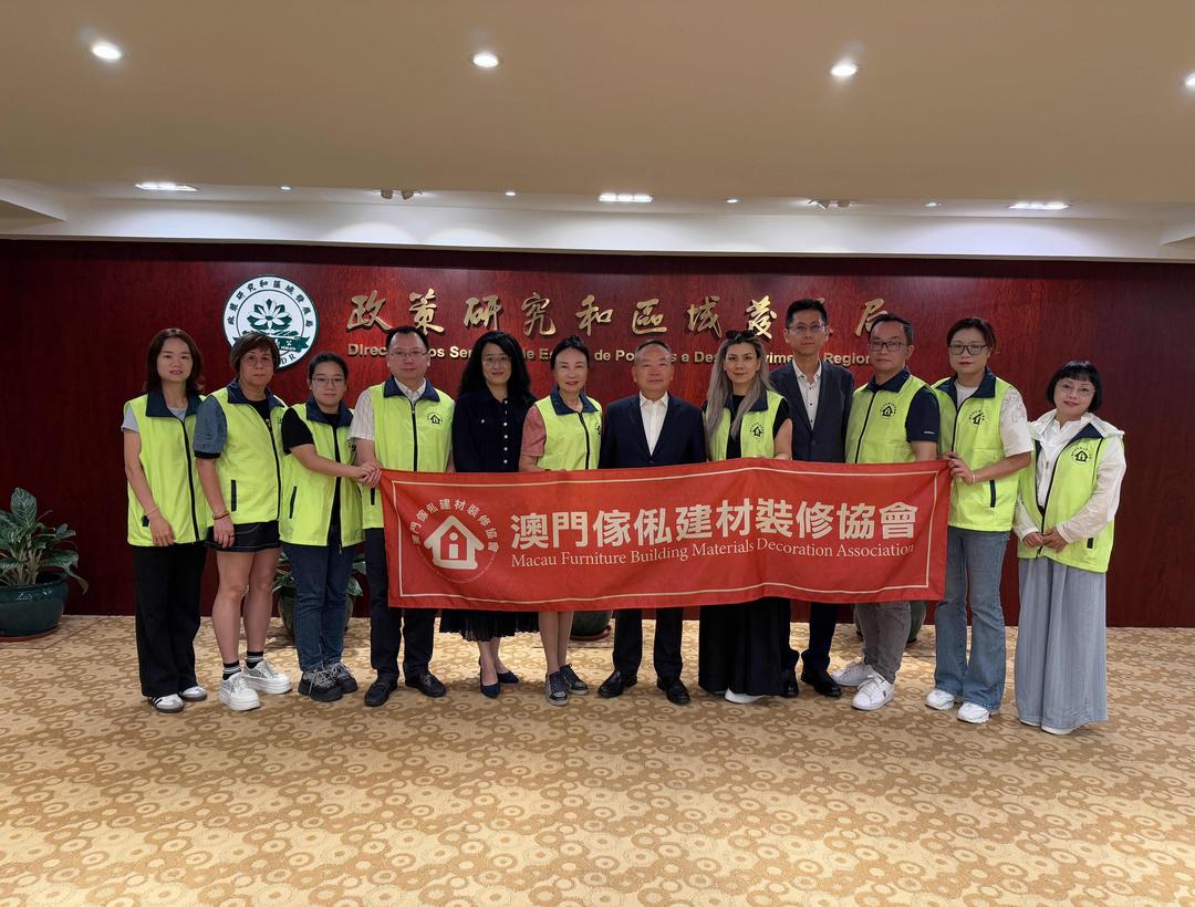 【灣新社/大灣區時報澳門訊】7月14日,澳門傢俬建材裝修協會在侯沐天會長的帶領下,一行九人拜訪了澳門政策研究和區域發展局。獲張作文局長的熱情接待,雙方就澳門經濟發展