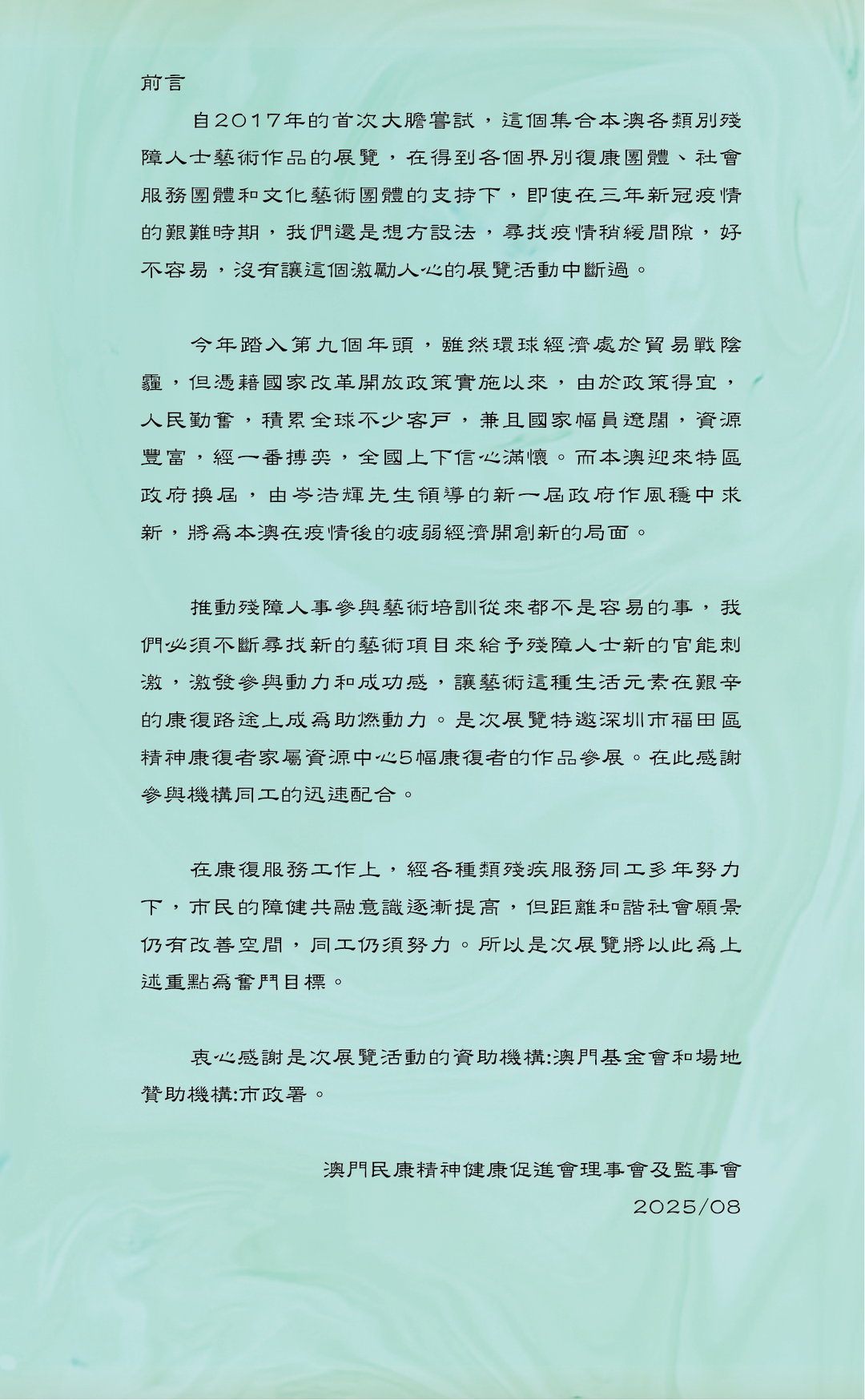 是次展覽合辦的本澳復康團體包括:利民會、扶康會、弱智人士家長協進會、展智服務協會、自閉症協會、展現真我協會、聾人協會、仁慈堂盲人重建中心、視障人士權益促進會。協辦的社服及文藝團體計有:工聯總會、婦聯總會、民眾建澳聯盟、特殊教育研究學會、賞心堂(澳門)書畫會、競新書畫學會、書法院、澳門中國書藝會、女子書法畫篆刻家協會、二龍喉詩友會、澳門中國書法家聯誼會、書畫藝術聯誼會、華基書畫藝術研究會、一帶一路書畫藝術研究會、37度藝文合作社、大灣區時報等。