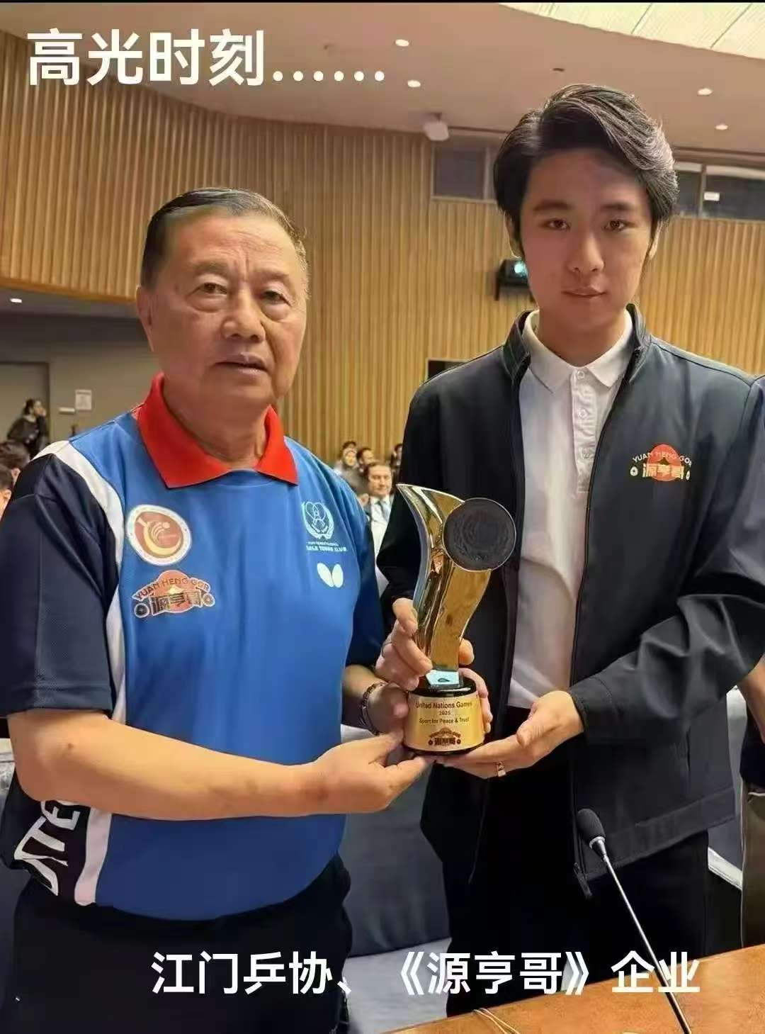 乒乓外交早已成為中美交流的經典符號,而這次不同凡響。此次活動不僅將江門代表團的風采帶入聯合國,還首次在聯合國運動會11個正式專案中設立了“乒乓球項目”,其中“源亨哥”品牌LOGO成功植入所有冠軍獎盃和主背景C位,創下聯合國賽事中中國企業形象的歷史性突破!