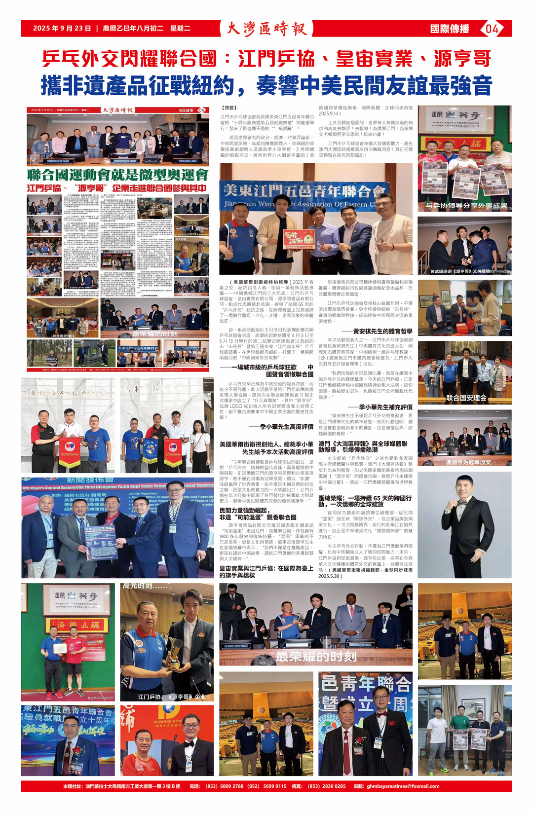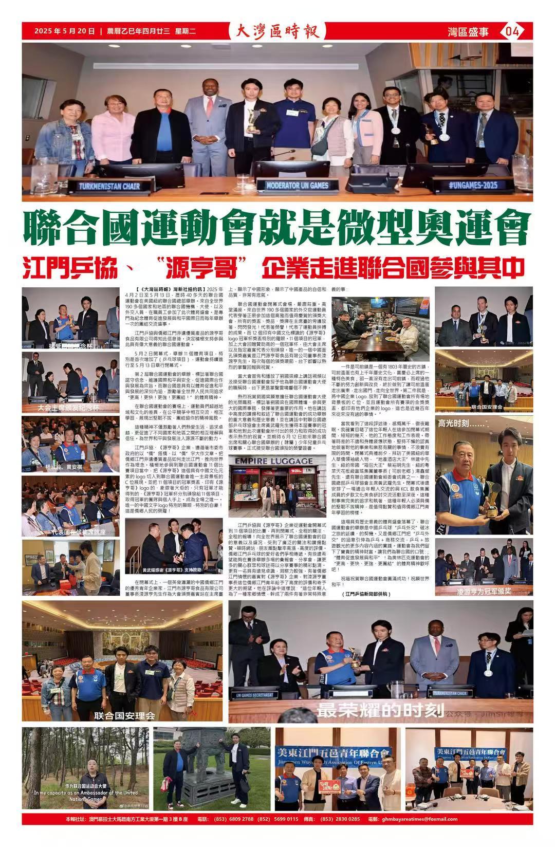 本次紐約“乒乓外交”之旅也受到多家國際主流媒體關注與點贊。澳門《大灣區時報》整版刊出系列報導,加之美國華爾街衛視特別策劃專題《“源亨哥”閃耀聯合國:微型乒乓奧運展示中國力量》,將這一江門僑鄉榮耀推向世界舞臺。