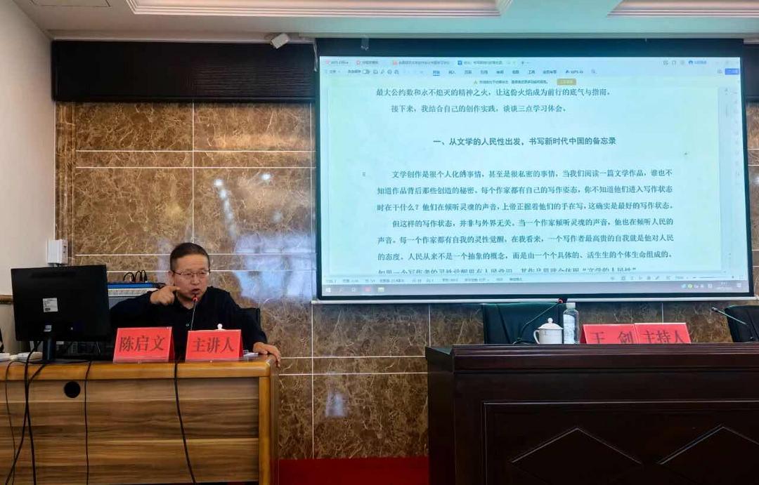 12月3日上午,汕尾市文联与汕尾开放大学联合开设专题讲座。陈启文会长以“书写新时代的备忘录、风物志和心灵史”为主题,结合自身多年文学创作经验,从文学的人民性、地域性以及从客观真实走向本质真实等方面,就报告文学创作进行专题交流。讲座内容丰富、见解独到,为作家们提供了宝贵的创作思路和方法,让大家受益匪浅。