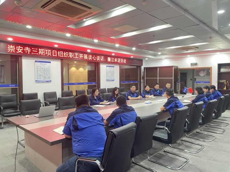 项目部邀请职工家属观看《严正家书》警示教育片,以案为鉴,敲响廉洁警钟;同时,党支部书记汪鹏主持召开了“家庭助廉”专题座谈会,倡导家属当好“廉内助”,常吹“廉洁风”,把好家庭“廉洁关”;党支部书记与关键岗位人员开展谈心谈话,深入了解干部职工思想动态和工作情况,强化廉洁从业意识;此外,项目部广泛张贴廉洁宣传海报,积极营造崇廉尚洁的浓厚氛围。