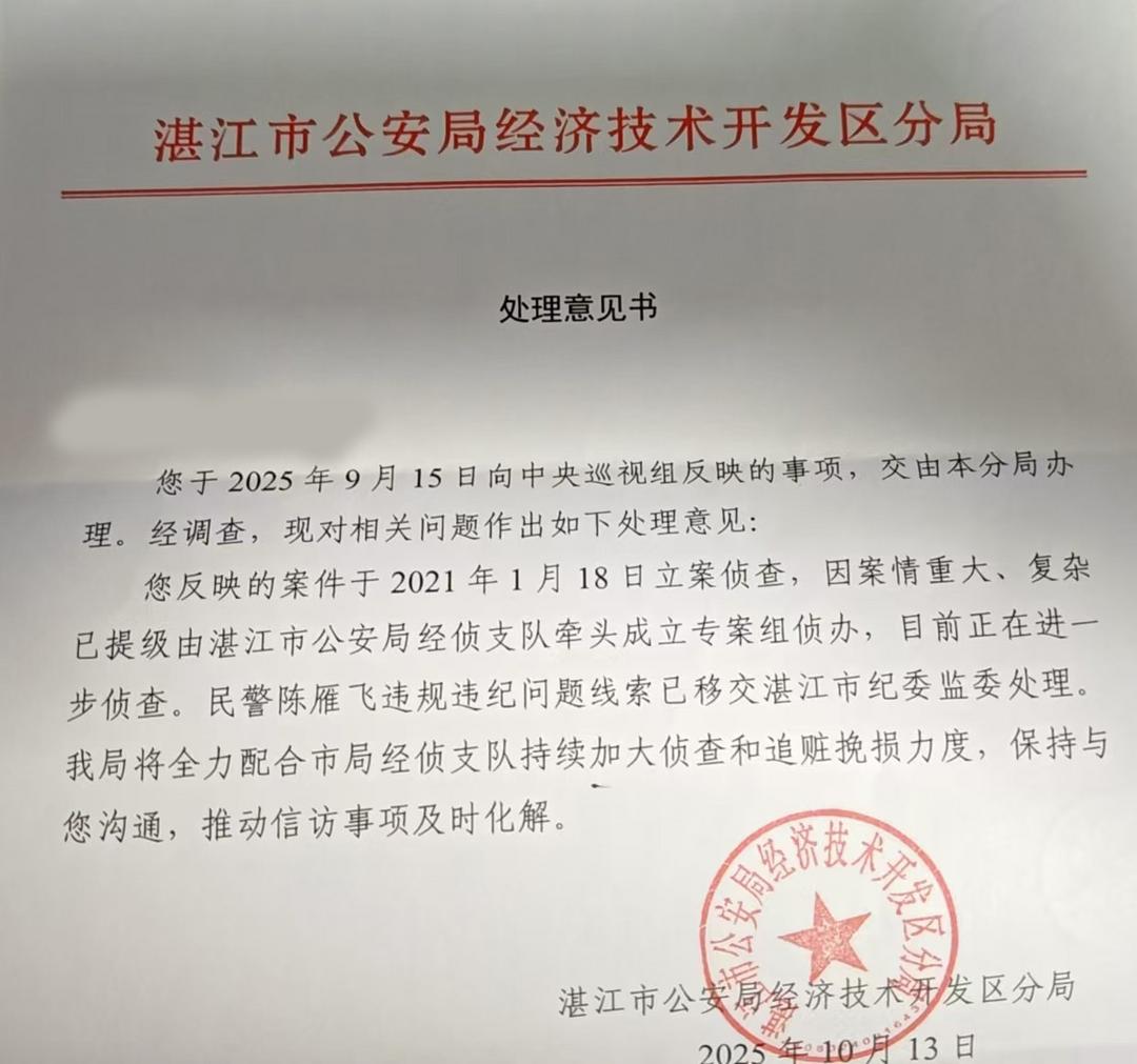 2025年9月15日,叶X恩向中央巡视组实名举报后,案件迎来转折。湛江市公安局经济技术开发区分局于2025年10月13日出具《处理意见书》,确认案件因“重大复杂”提级由市局经侦支队侦办,民警陈雁飞涉嫌违规违纪线索已移交湛江市纪委监委。
