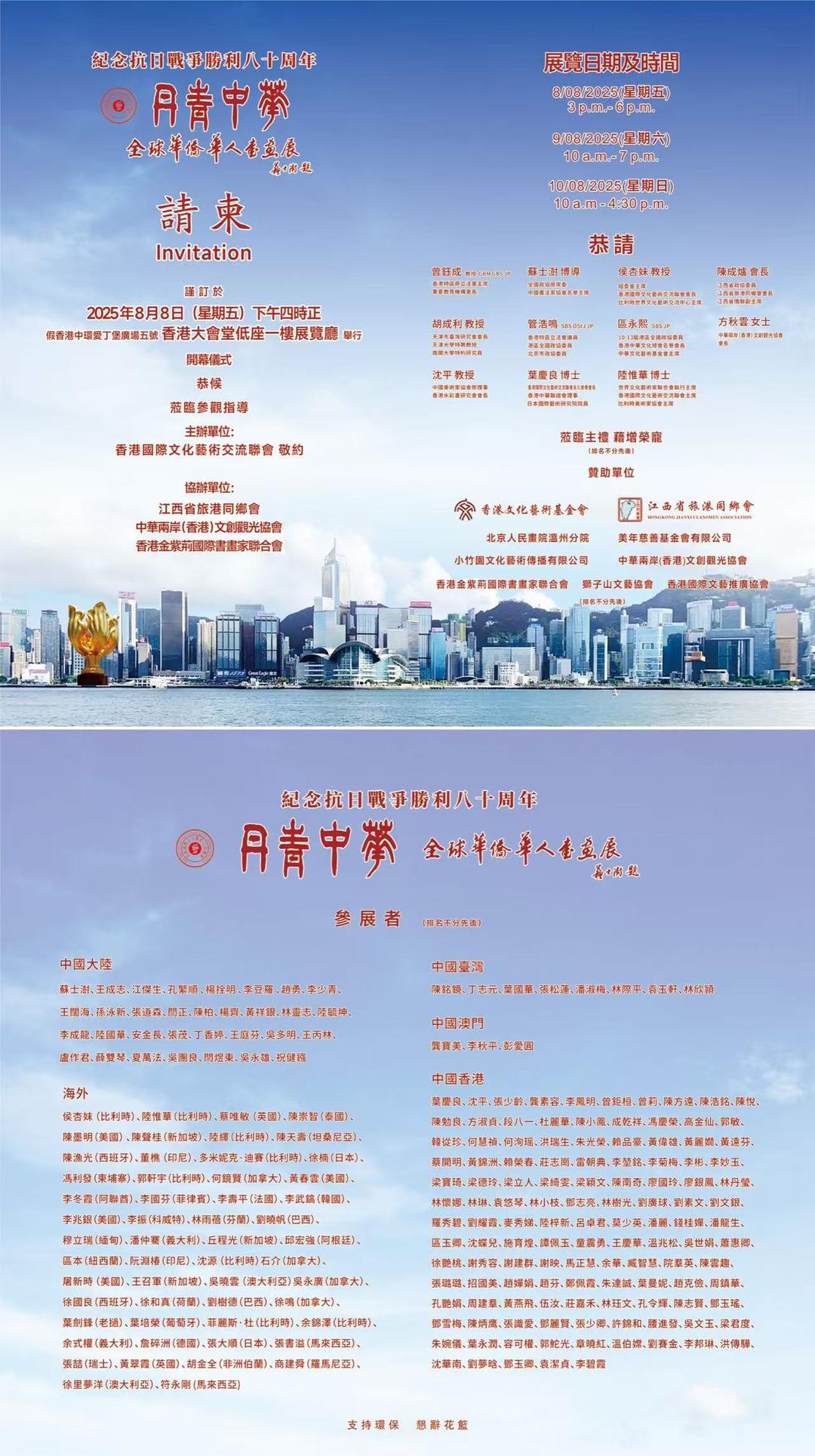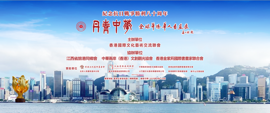 (灣新社/大灣區時報香港訊,記者李翔綜合報道)由香港國際文化藝術交流聯會主辦,江西省旅港同鄉會、中華兩岸(香港)文創觀光協會、香港金紫荊國際書畫家聯合會協辦的紀念抗日戰爭勝利80週年“丹青中華·全球華僑華人書畫展”於8月8日在香港大會堂举行开展仪式。香港特区立法会前主席、大紫荆勋章获得者曾钰成,多名港区全国政协委员、特区立法会议员、香港中联办代表等出席,來自多個國家的華僑華人、兩岸和港澳人士200多人参加。港区全国政协常委、中国和平统一促进会香港总会会长姚志胜题词致贺,第十三届全国政协常委、原中国书法家协会会长苏士澍题写展标,天津市归国华侨联合会发来贺信。