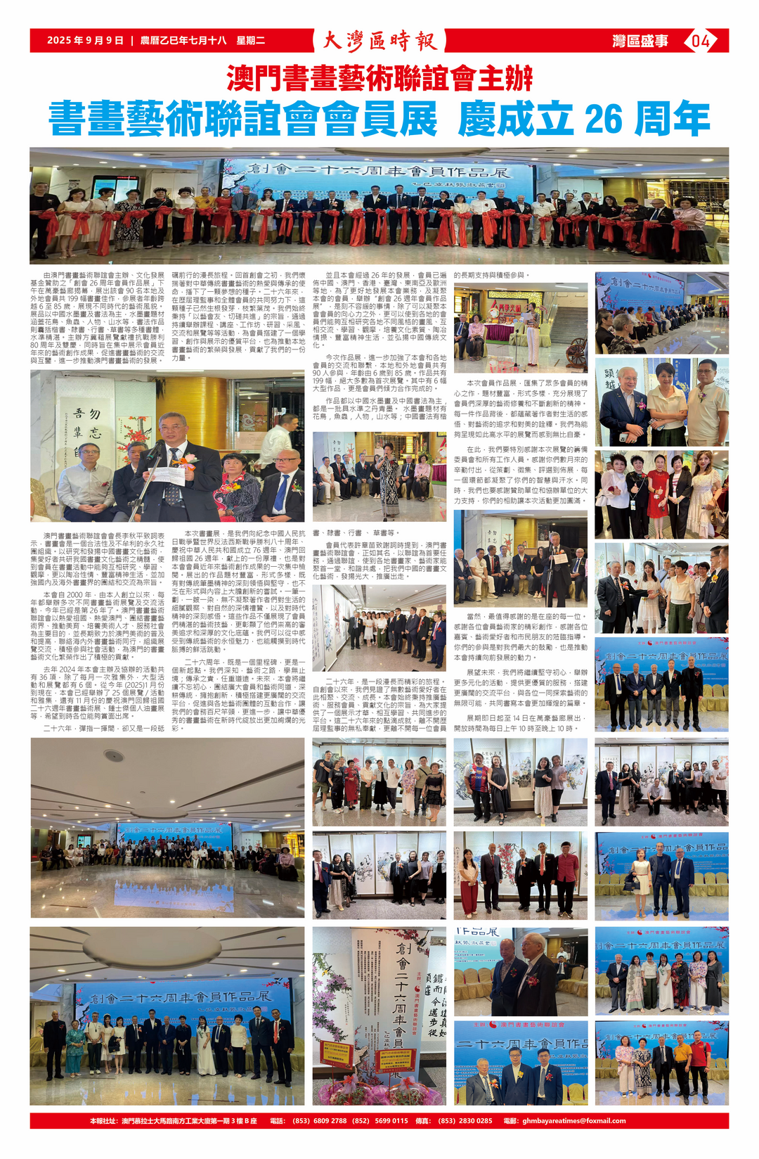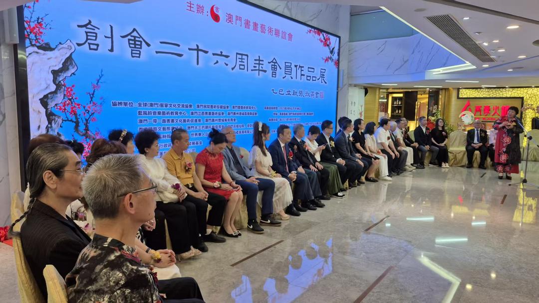 (大灣區時報澳門訊,記者李翔、攝影/黃傑華、 林康桂報道)由澳門書畫藝術聯誼會主辦、文化發展基金贊助之「創會26周年會員作品展」9日下午在萬豪藝廊揭幕,展出該會90名本地及外地會員共199幅書畫佳作,參展者年齡跨越6至85歲,展現不同時代的藝術風貌。展品以中國水墨畫及書法為主,水墨畫題材涵蓋花鳥、魚蟲、人物、山水等,書法作品則囊括楷書、隸書、行書、草書等多種書體,水準精湛。主辦方冀藉展覽獻禮抗戰勝利80周年及雙慶,同時旨在集中展示會員近年來的藝術創作成果,促進書畫藝術的交流與互鑒,進一步推動澳門書畫藝術的發展。
