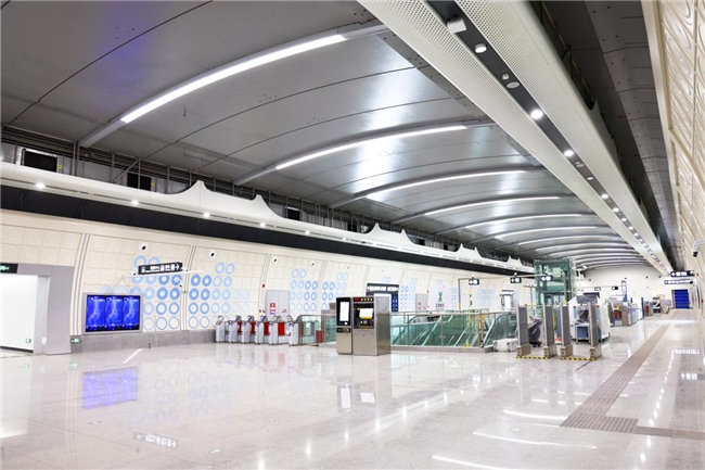 具体来看,大安站以“未来之城”为设计理念,融入园山科技元素和阿波罗高新产业园特色,其风管通过局部包覆与灯光呈现未来科技风格,墙面则以标准化、模块化和可拆装一体化构件打造,体现深圳科技创新之都的城市特色。