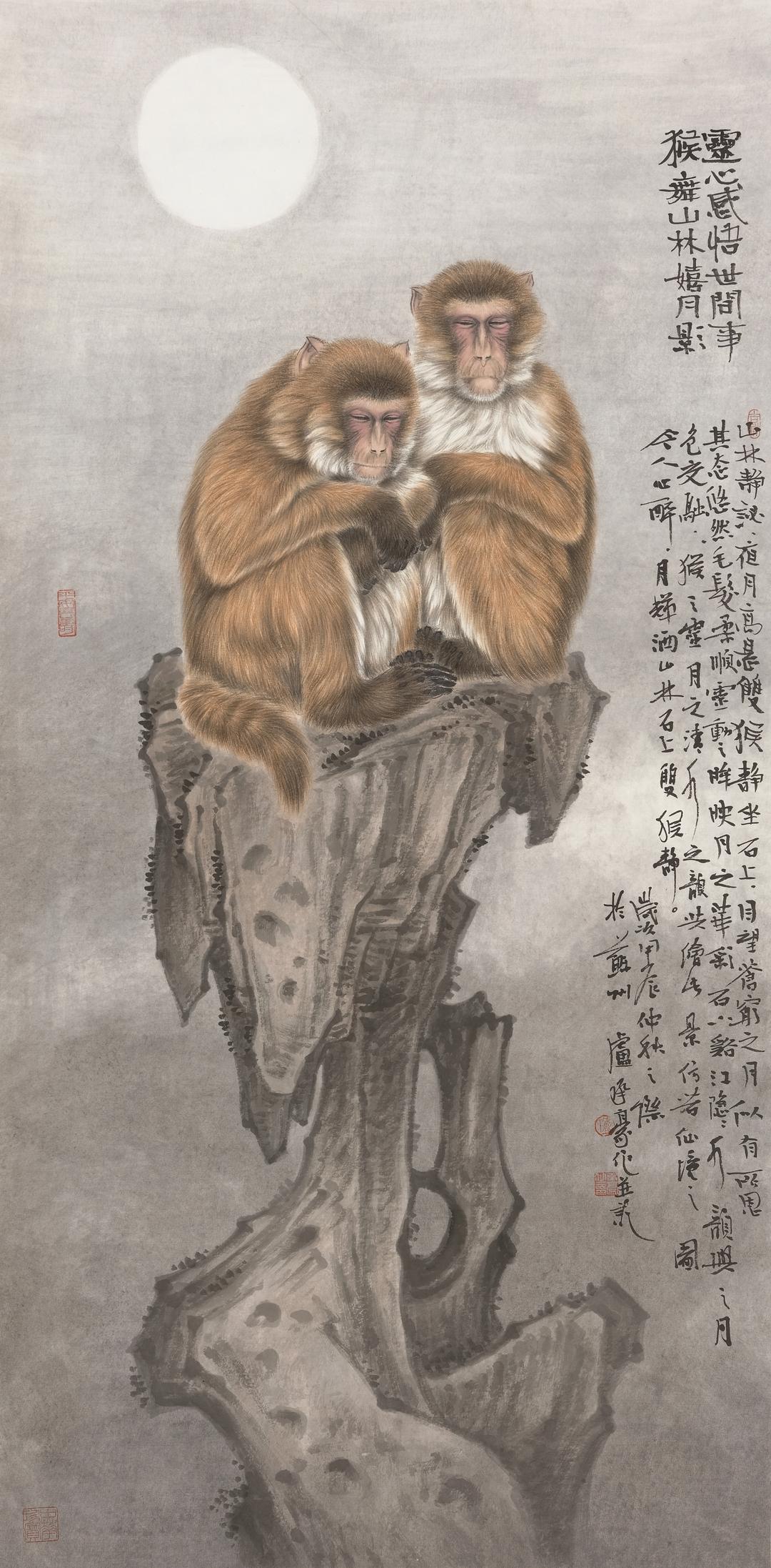卢承豪作品名称《灵猴嬉月影》,六尺整规格:180X98Gm,材质:生宣。