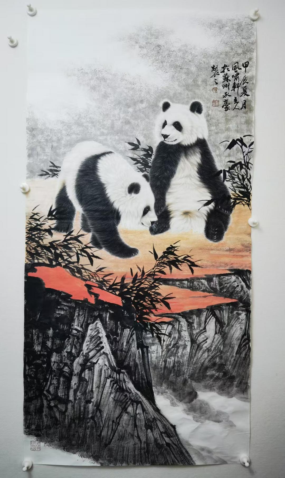 卢承豪作品熊猫系列图名称《熊猫图》,三尺整规格:100X50cm,材质:生宣。。