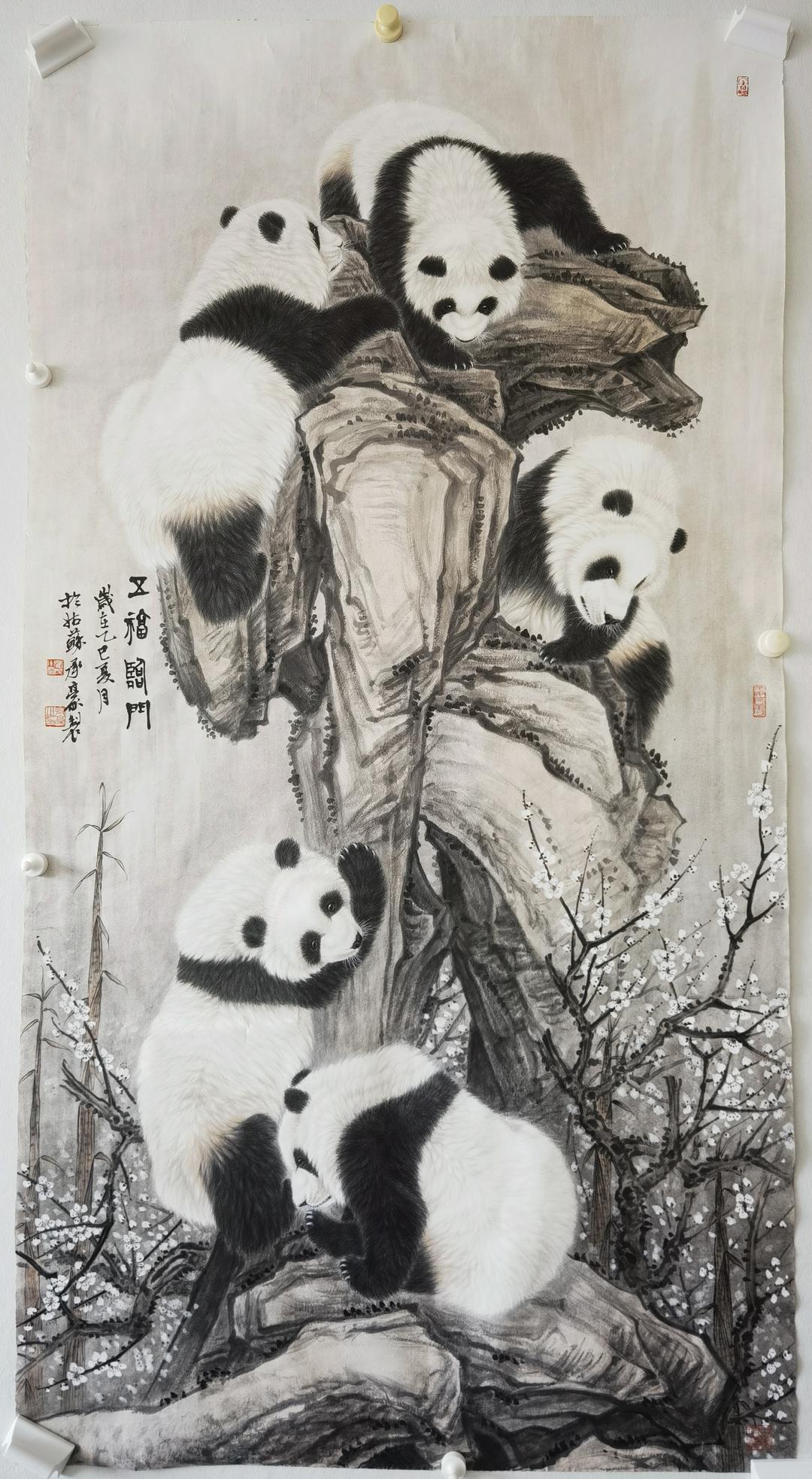 卢承豪作品熊猫名称《五福临门图》,规格:126X248cm,材质:生宣。
