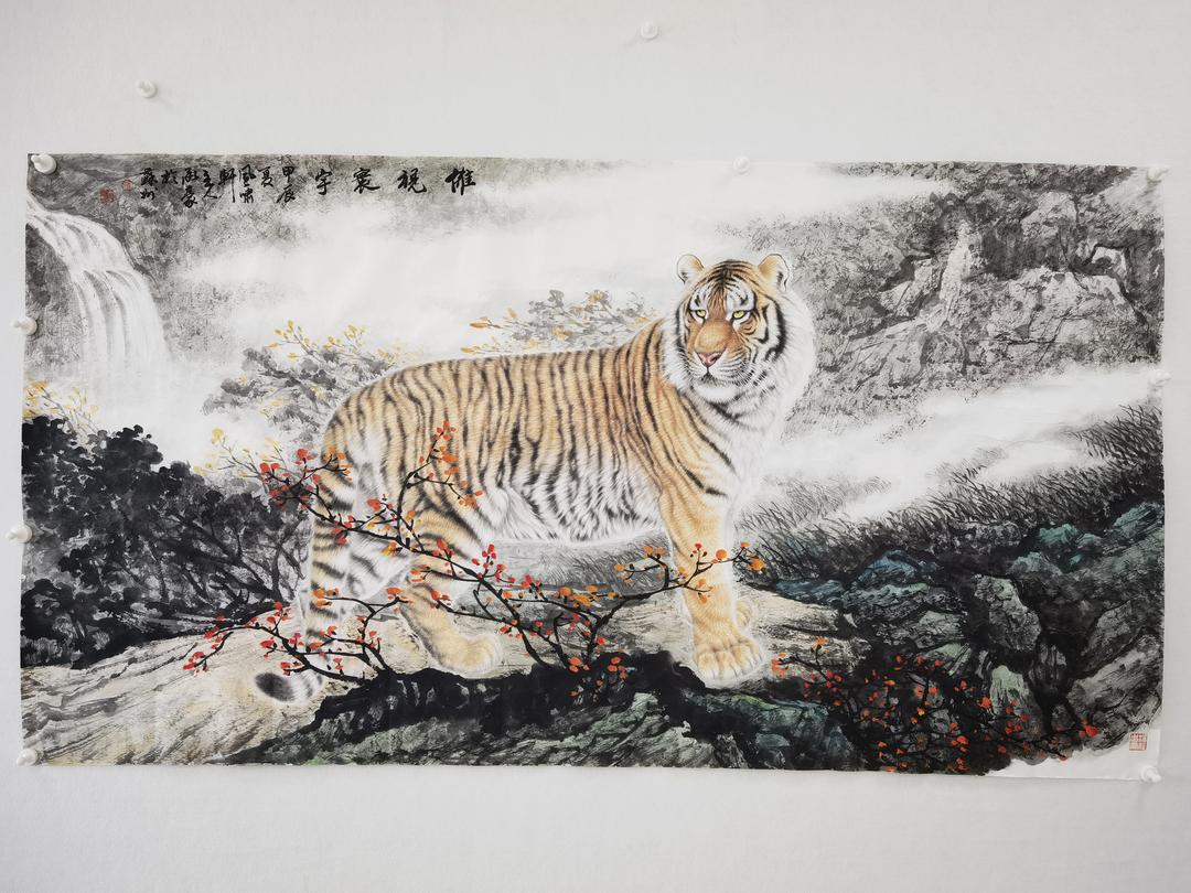 正是通過這種超寫實的技法塑造,讓他的虎畫作品拒絕了民間虎畫的煙火氣,也避免了宮廷官家畫的呆僵質,剔其弊,取其精,合成民間虎畫的裝飾價值與宮廷官家虎畫的正大氣象,再通過自己對自然虎的生態寫生提煉,形成了裝飾臻美、技法精湛、藝術價值和收藏價值雙重立巔的至尚品格。讓他的虎畫作品借助超寫實的精益求精,一舉奪得了這天下畫虎的頭魁!成為裝飾、鑒賞、收藏、文化交流的絕佳選項!