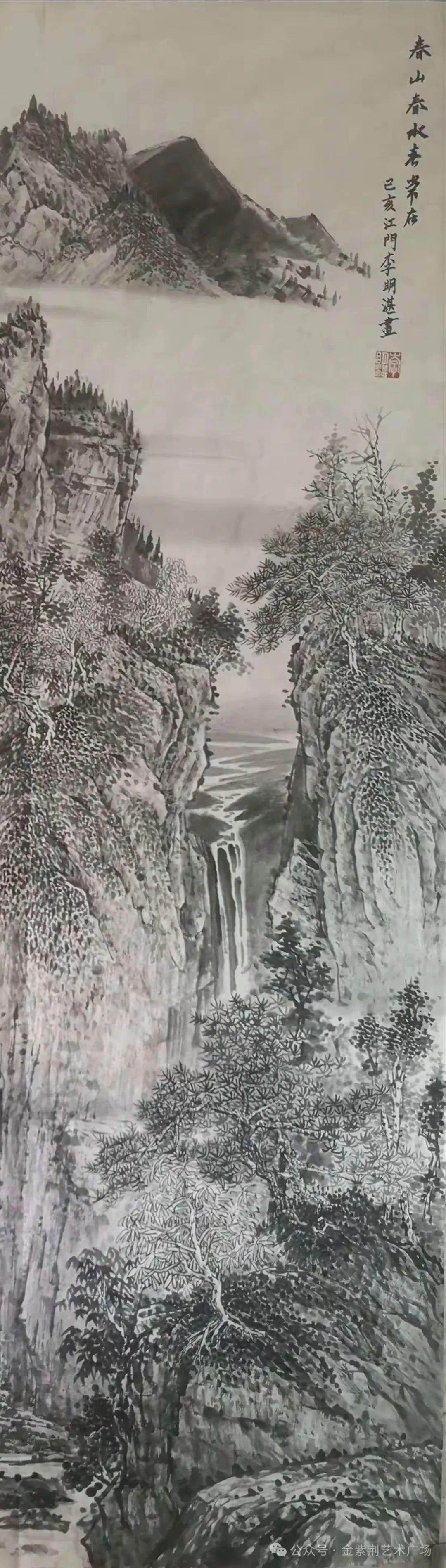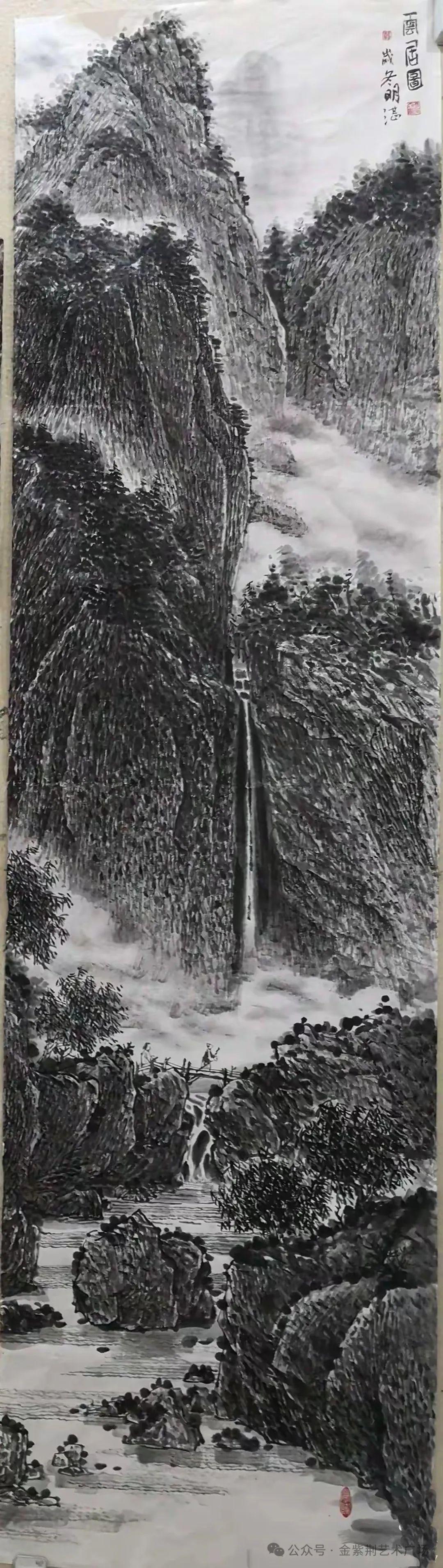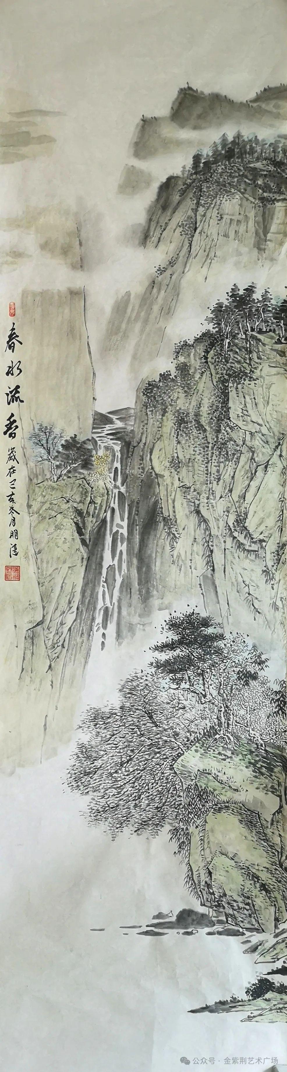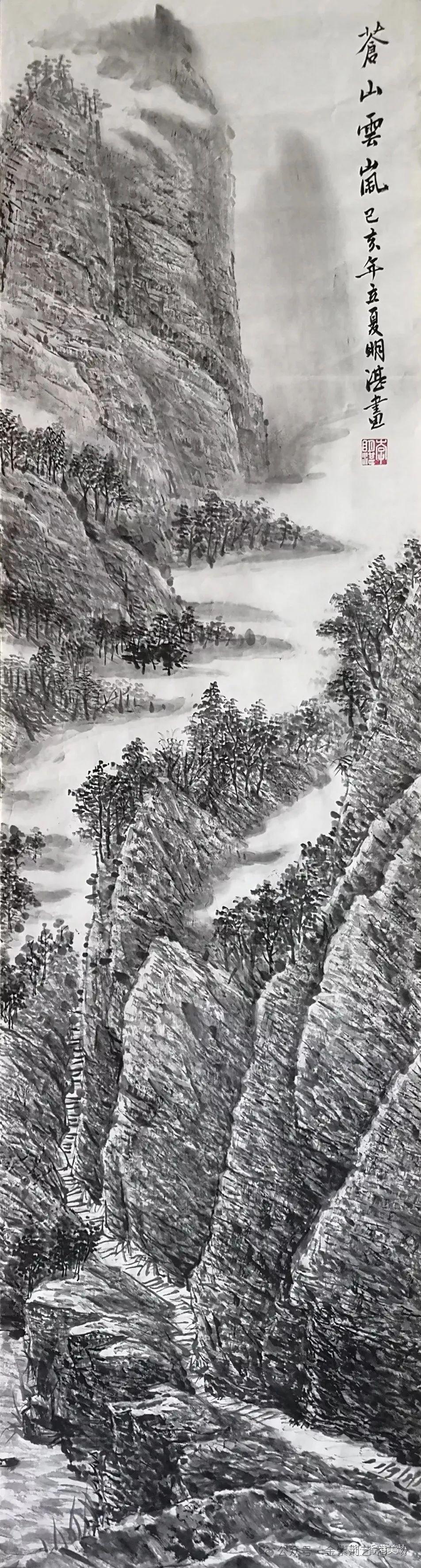 宋画的精神骨骼在他作品中清晰可辨。那些斧劈皴法塑造的山石肌理,仿佛能触摸到千年的时光;每幅作品构图中层层推进的景深,让人恍若置身北宋画家丈量过的天地。但明湛并未止步于临摹古法,《春山春水春常在》里,他用水墨点染的春山,既保留了宋代山水对自然秩序的敬畏,又让墨色在宣纸上自然晕染出当代水墨特有的通透感。