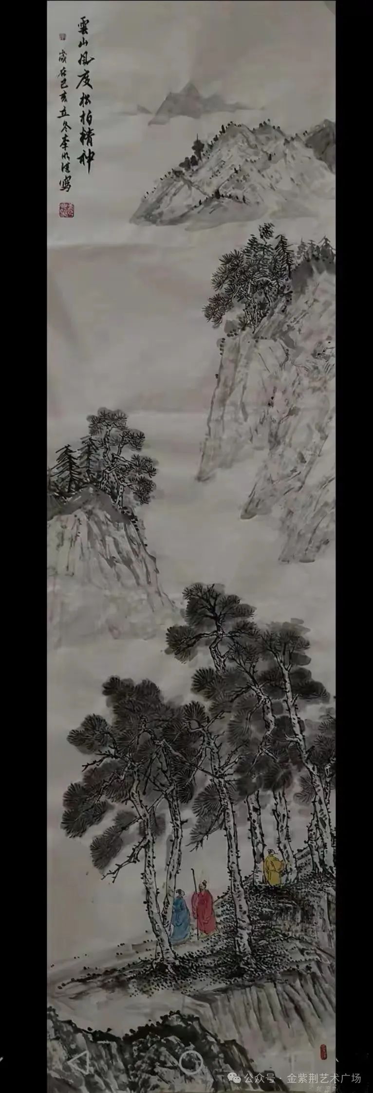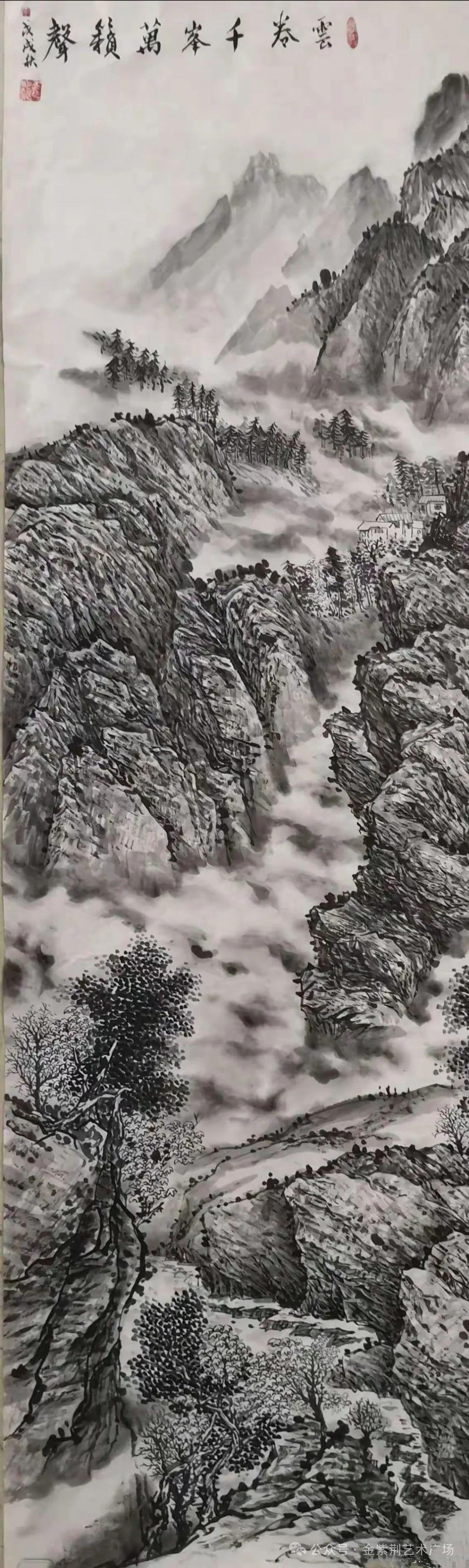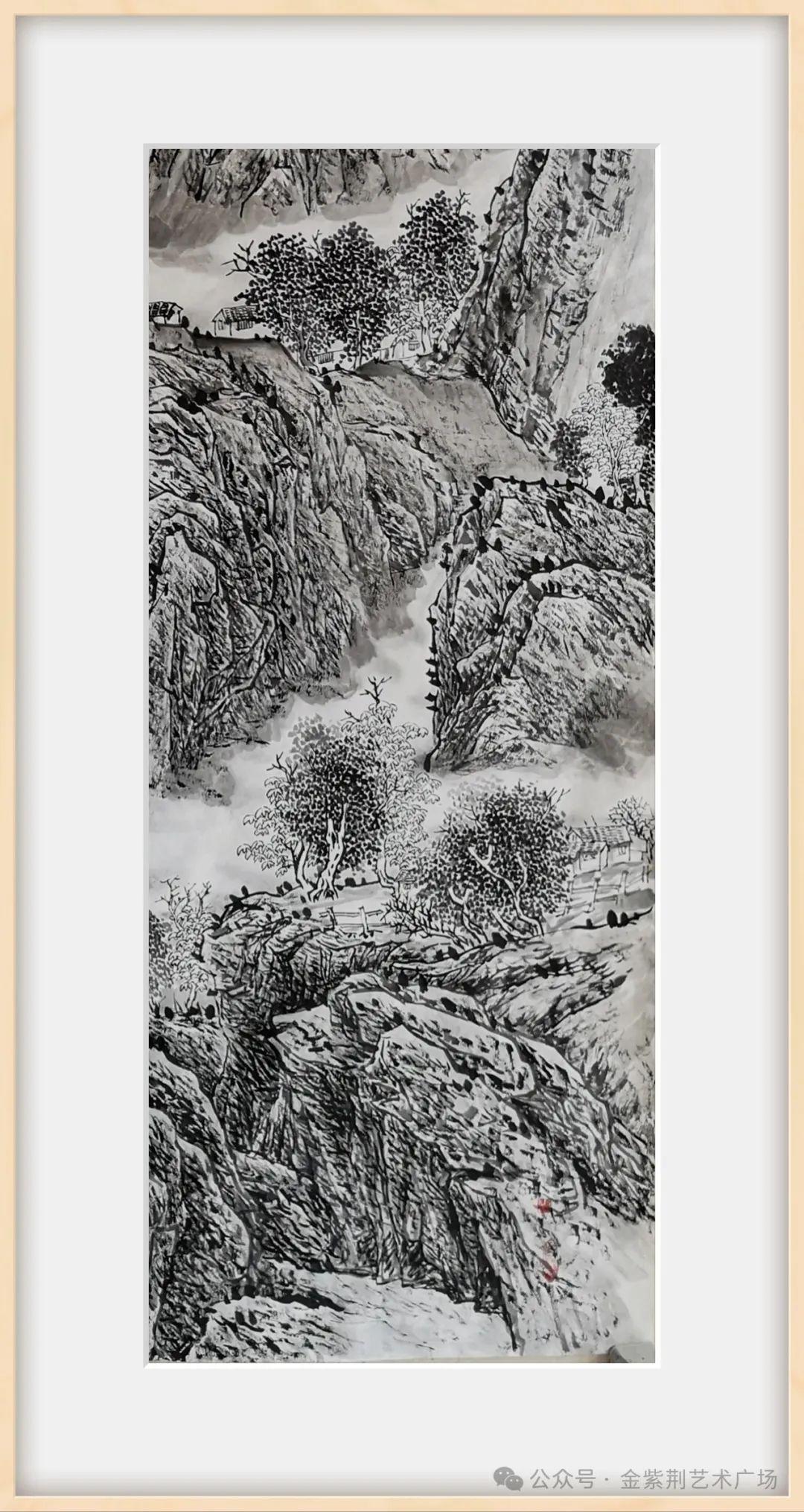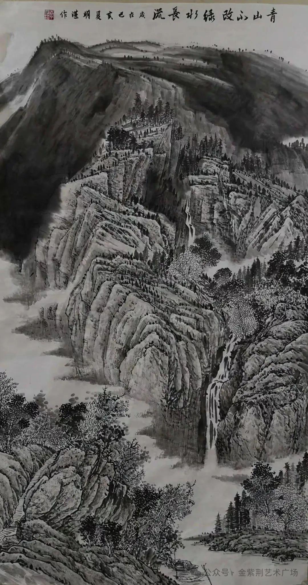 最令人动容的是画面中弥漫的诗意。明湛山水里总有一缕未散的晨雾,一抹将褪的夕照,这些光色变幻既是对自然瞬间的捕捉,更是对永恒诗意的追寻。《云山风度松柏精神》中,苍松与山岚构成的虚实相生,让人想起"行到水穷处,坐看云起时"的禅意;《青山不改绿水长流》里,山间杂树在墨色山水中温柔绽放,恰似韩愈《晚春》“䓍树知春不早归,百般红紫斗芳菲”的意境在现代宣纸上的重生。这些作品不单是视觉的山水,更是可供心灵栖居的诗意空间。