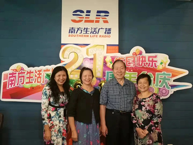 应余秀云(左一)之邀,四姐苏家芳(左二)、四姐夫乔平(左三)和五妹苏小华到电台直播。