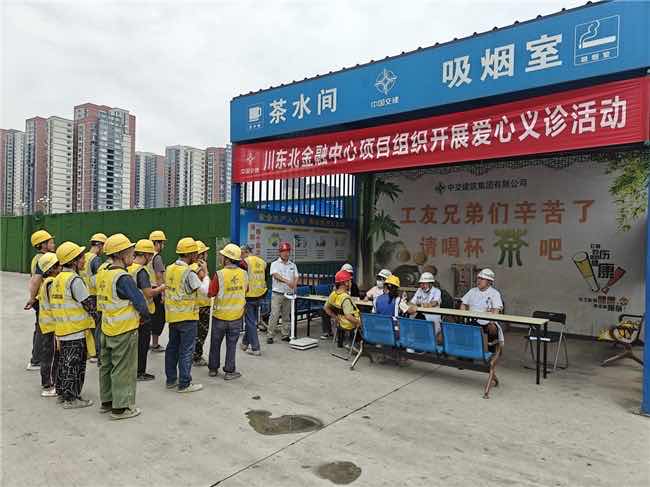 近日,中交建筑集团第二工程有限公司川东北金融中心项目联合四川片区工会,以“我为群众办实事”实践活动为引领,邀请专业医护人员走进施工现场开展爱心义诊,切实落实“安全生产”中“关注员工职业健康”的民生要求。