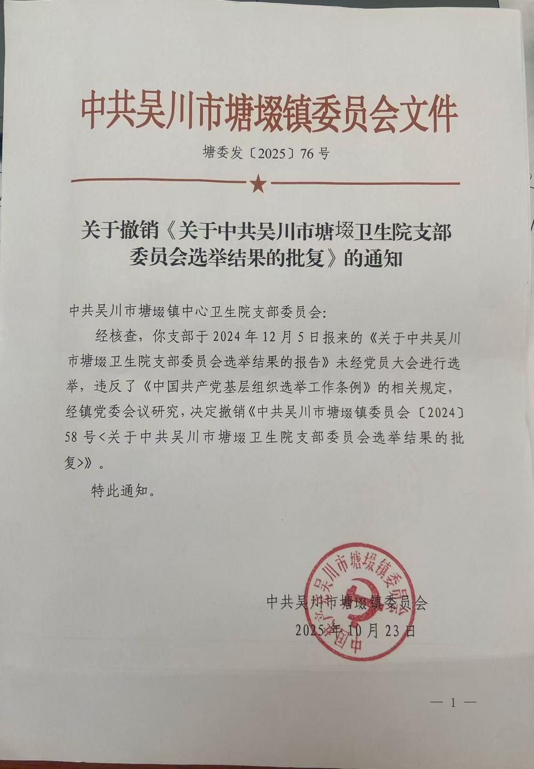 2024年12月5日,塘㙍镇中心卫生院党支部向上级党委报送选举结果,李旭“当选”为支部书记。然而,这份报告被镇党委认定为未召开党员大会,违反《基层组织选举工作条例》,并于2025年10月23日正式撤销批复。