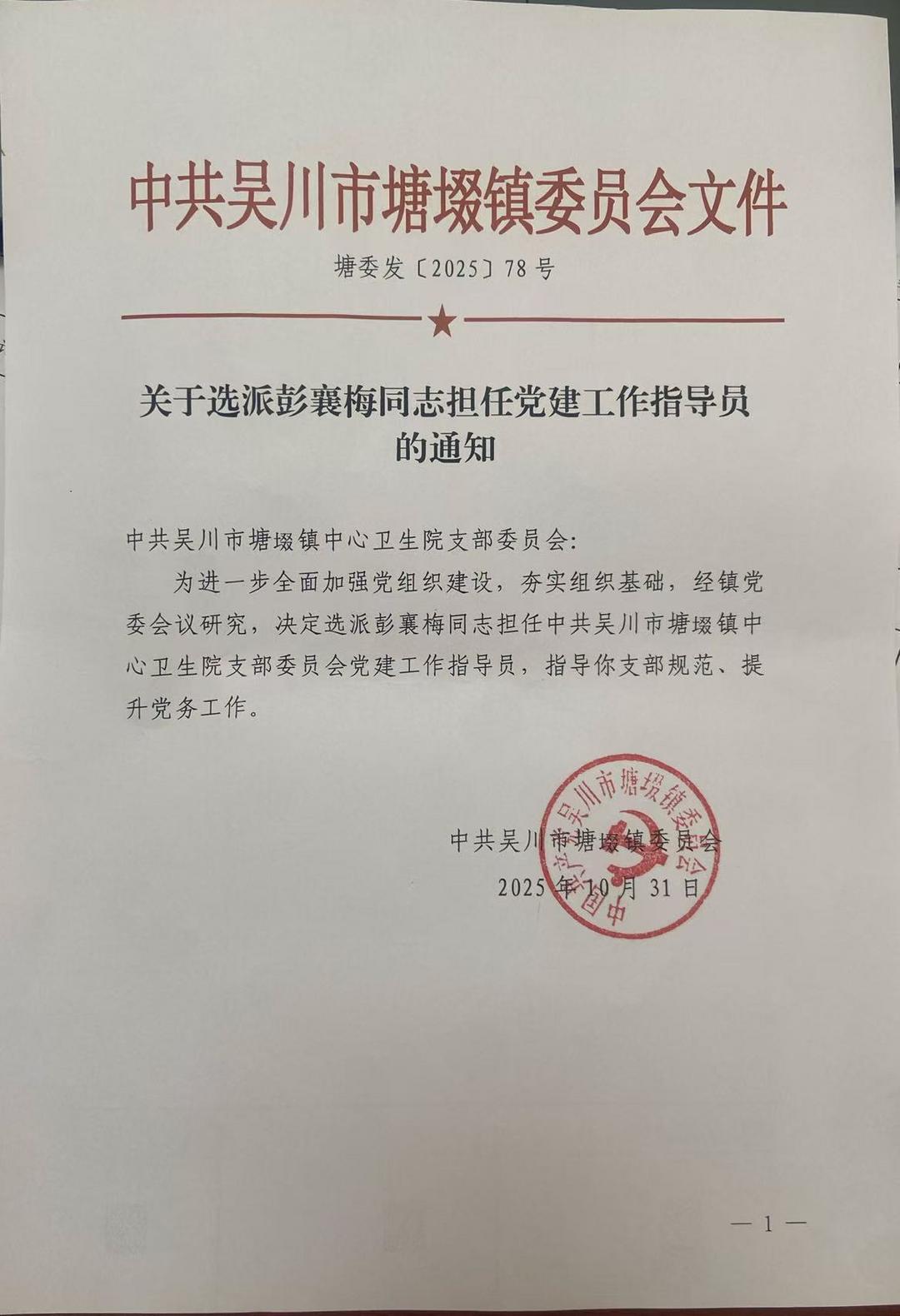 10月31日,为进一步全面加强党组织建设,夯实组织基础,经塘㙍镇党委会议研究,决定选派彭襄梅担任塘㙍镇中心卫生院党支部党建工作指导员。