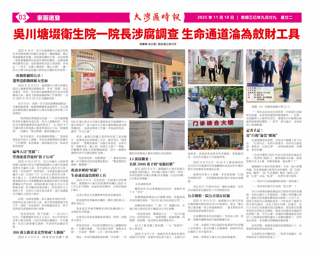 2025年10月21日,塘㙍镇中心卫生院多名党员联名紧急致信吴川市卫健局,提出“党公章已被收缴,院公章风险极高”,要求对院长李旭加强监督和责任追究。