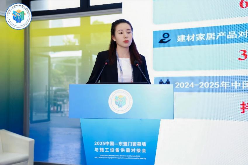 西安高科建材科技有限公司市场规划部负责人朱丹以“科创领航——与东盟共建建材出海新征程”为题作了报告。她指出,高科建材作为中国建筑金属结构协会副会长单位,具备建筑门窗幕墙产业链的完整产品线,拥有雄厚的科技创新实力与丰富的海内外业绩,公司将以“深度本地化+链式出海”的市场策略从单一产品输出转向与当地协同共生模式。她呼吁业内企业深化合作、共享资源,携手开拓东盟市场新蓝海,共同塑造中国建材高端、绿色、智能的国际新形象。